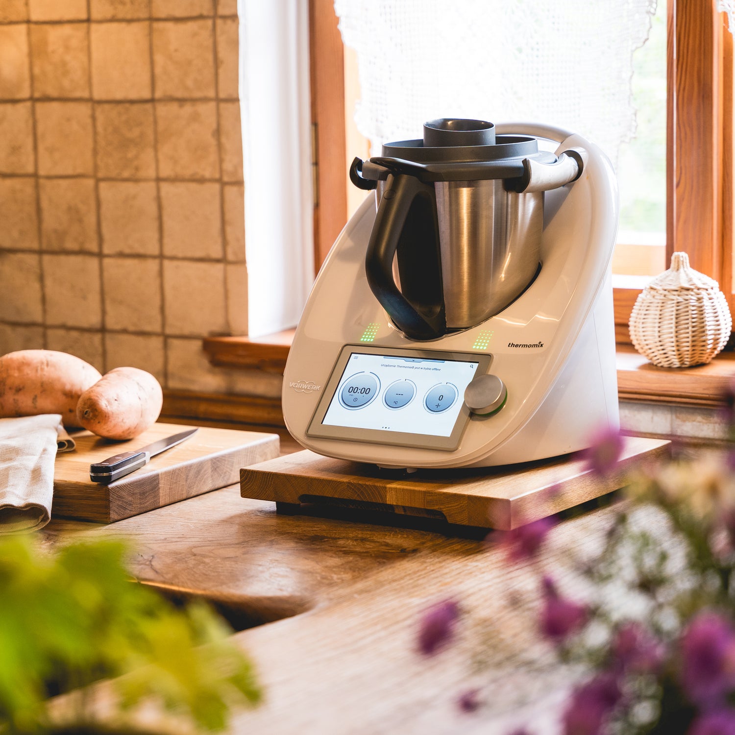 Wygodnie unosisz deskę, a kółka pod spodem deski opierają się na blacie. Od tego momentu deskę wraz z Thermomix'em można z łatwością przesuwać i obracać o 360 stopni. Themomix w trakcie używania stabilnie stoi na podstawce.