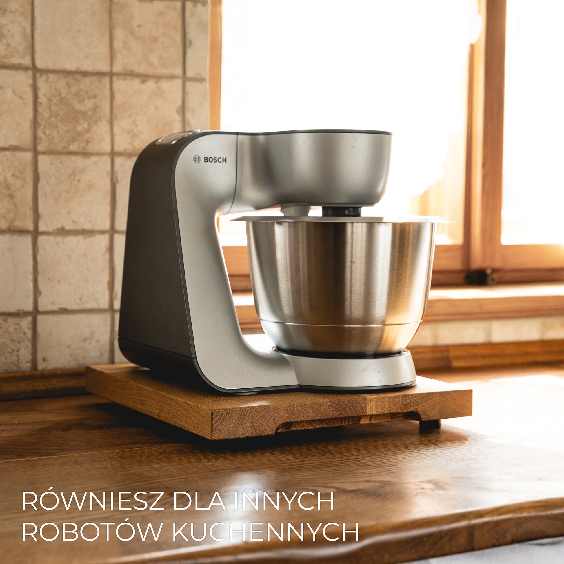 Podstawka z litego drewna pomaga w bezpiecznym i łatwym przesuwaniu ciężkiego Thermomixa po blacie kuchennym. Wystarczy lekko unieść, aby deska mogła być swobodnie przesuwana. Deska pozostaje stabilna dzięki czterem gumowym nóżkom, które zapewniają doskonałą przyczepność do blatu. Dzięki temu nawet intensywna praca z Thermomixem nie stanowi żadnego problemu dla podstawki.